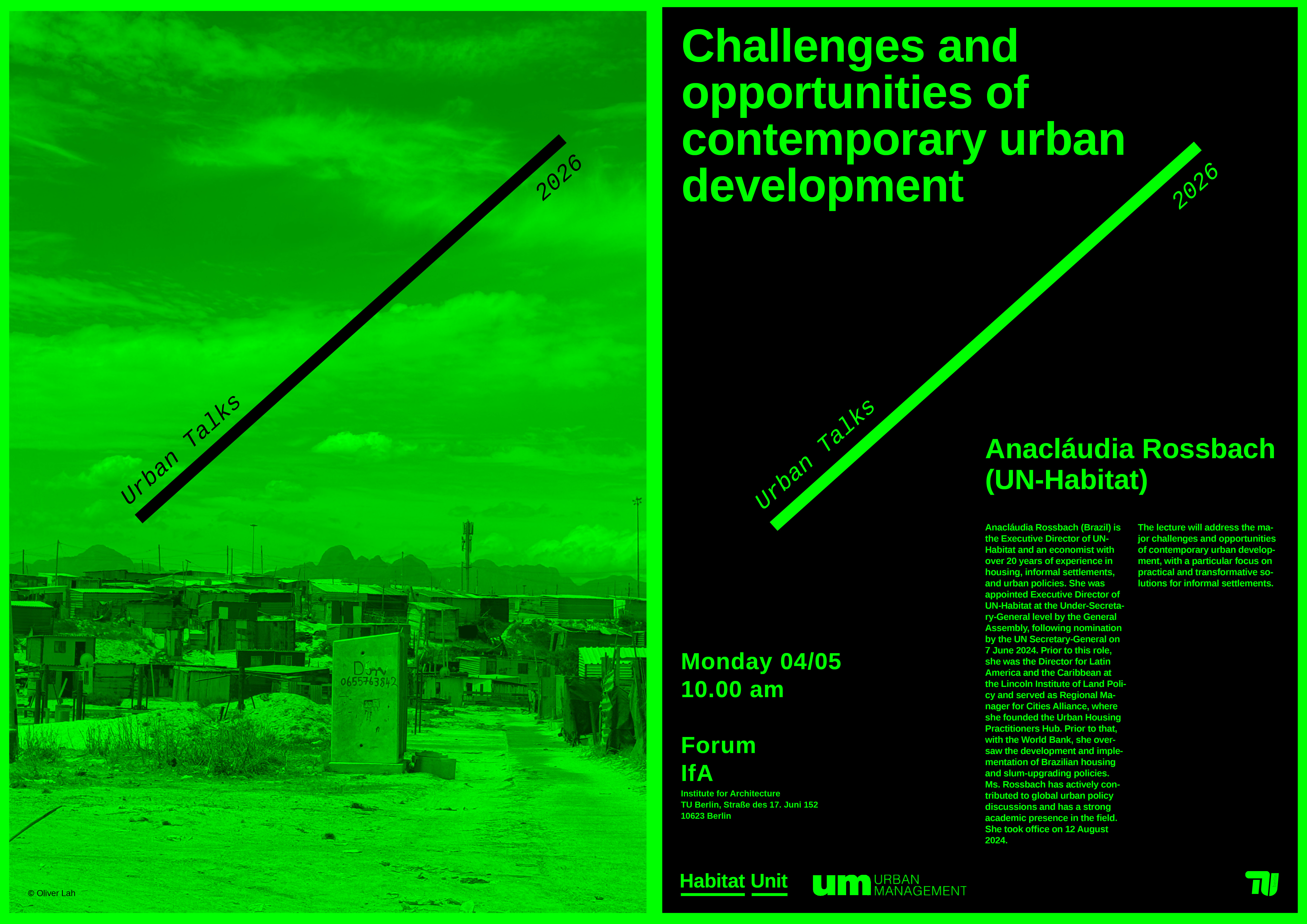 The lecture will address the major challenges and opportunities of contemporary urban development, with a particular focus on practical and transformative solutions for informal settlements.