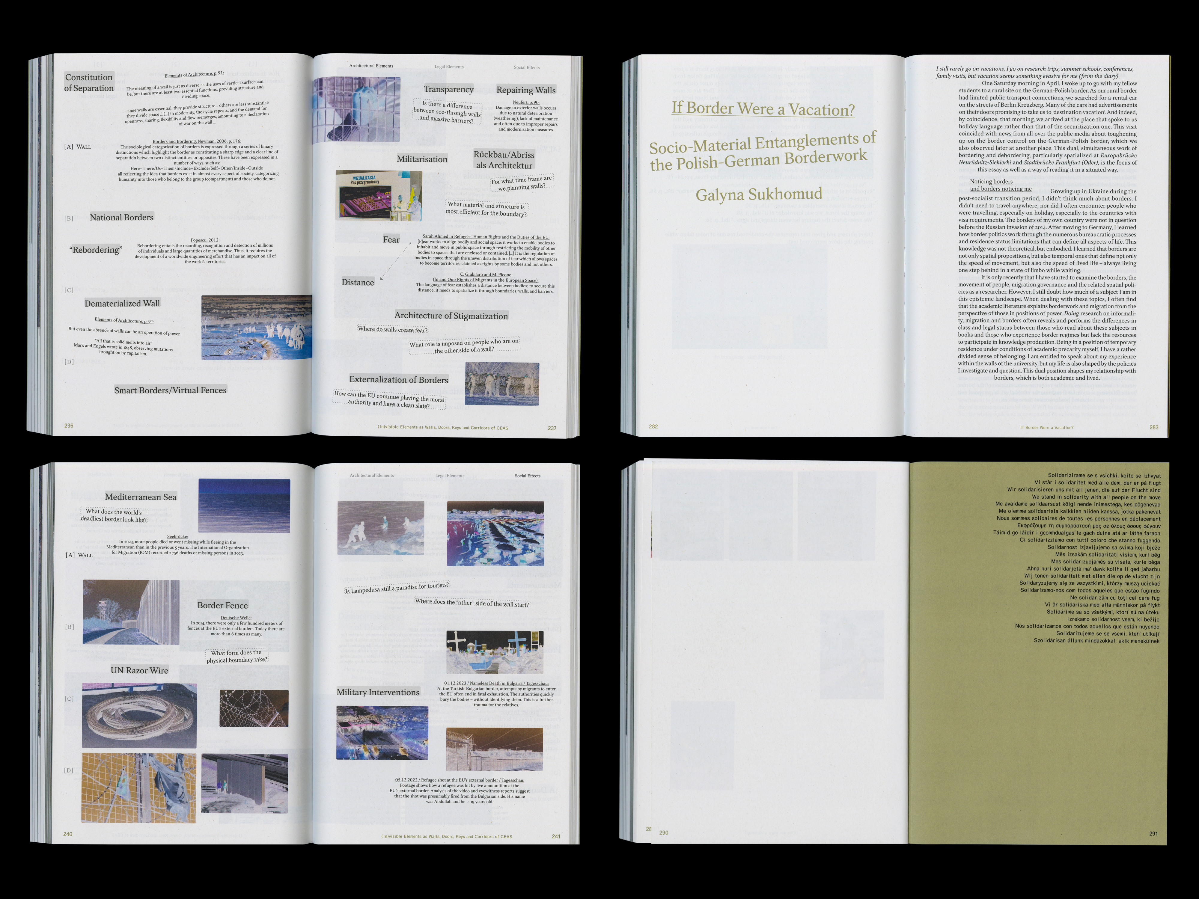 „Architecture as a discipline is also involved when power monopolies and violent spatial orders are established through space itself. Recognizing these moments as architectural production and critically examining them, is a central concern of the works gathered in this book. In this regard, the discipline of architecture plays a dual role: on the one hand, it is complicit in the creation of undemocratic spaces through its construction mechanisms; on the other, it holds the tools to analyze, map, and deconstruct those mechanisms. In this way, the discipline is deployed against itself, toward its own interrogation and further development.“