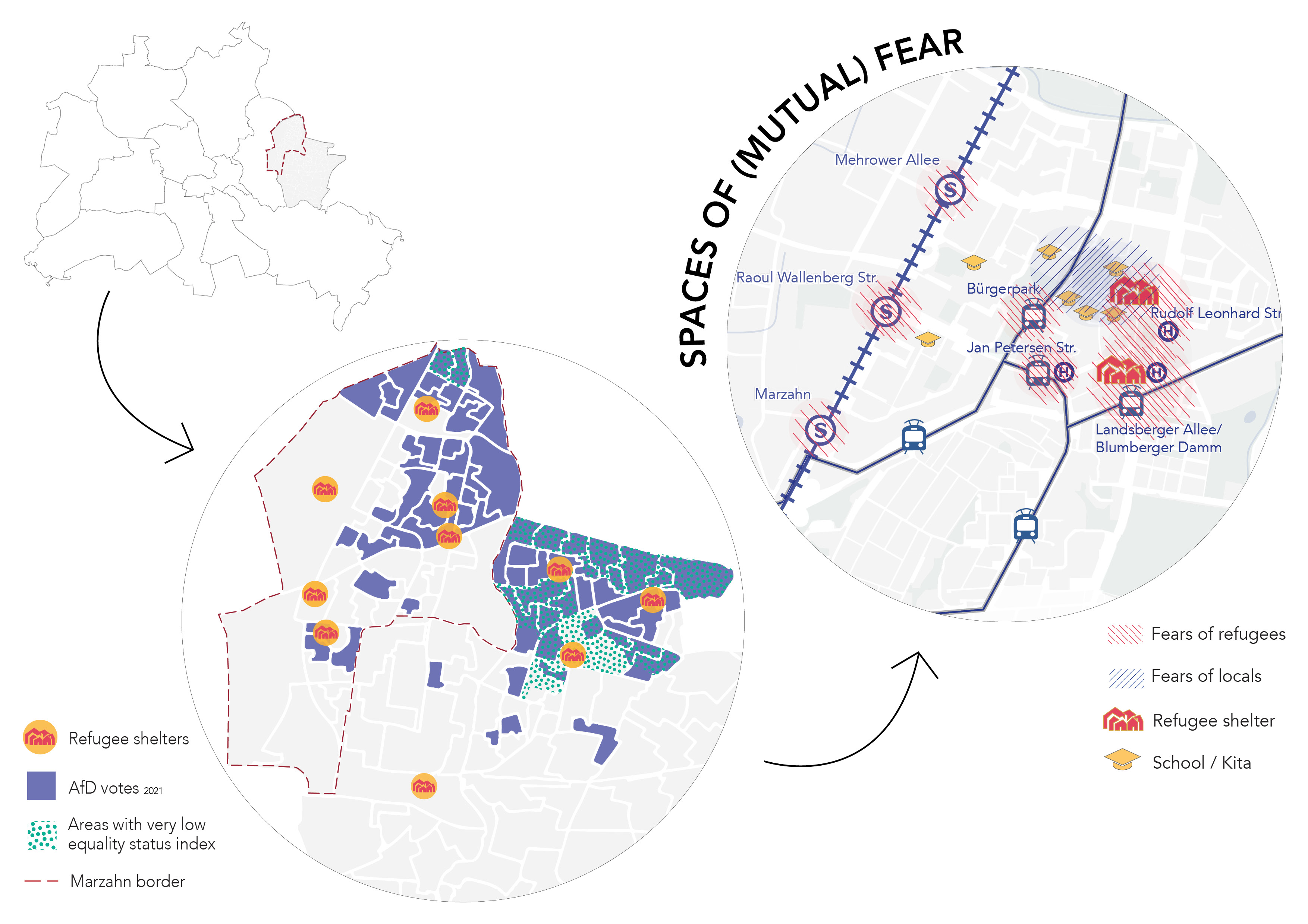 This study examines the challenges of integration and adaptation in the context of a multicultural society, focusing on the Marzahn district of Berlin, where the local society shows a high degree of skepticism towards refugees, resulting in the feeling of fear between both groups. The approach of mutual integration and adaptation is the result of a redefinition of conventional integration strategies and theories, leading to a shift from a one-way to a two-way process, involving refugees and locals.