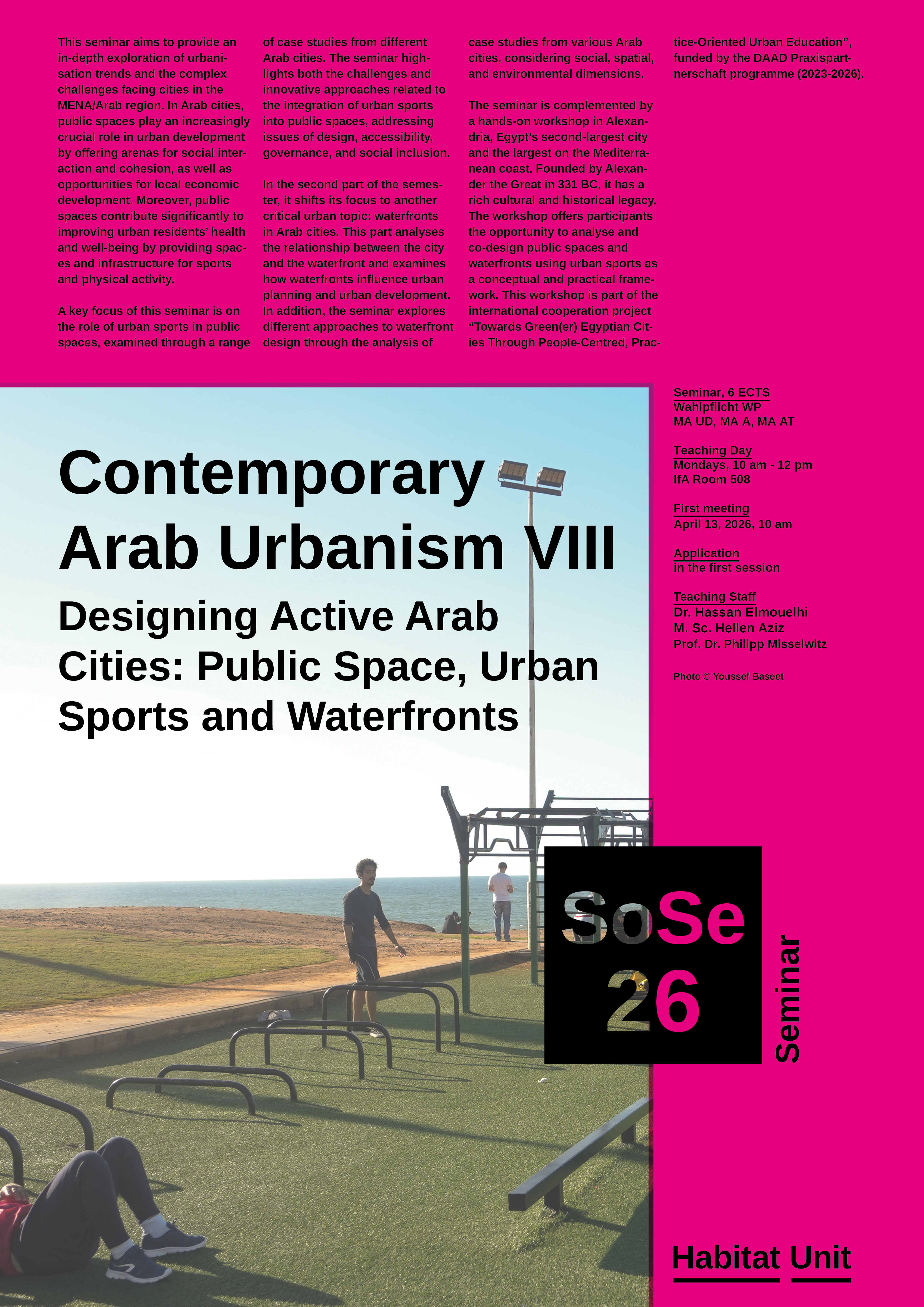 The seminar is complemented by a hands-on workshop in Alexandria, Egypt’s second-largest city and the largest on the Mediterranean coast. Founded by Alexander the Great in 331 BC, it has a rich cultural and historical legacy. The workshop offers participants the opportunity to analyse and co-design public spaces and waterfronts using urban sports as a conceptual and practical framework. This workshop is part of the international cooperation project “Towards Green(er) Egyptian Cities Through People-Centred, Practice-Oriented Urban Education”, funded by the DAAD Praxispartnerschaft programme (2023-2026).