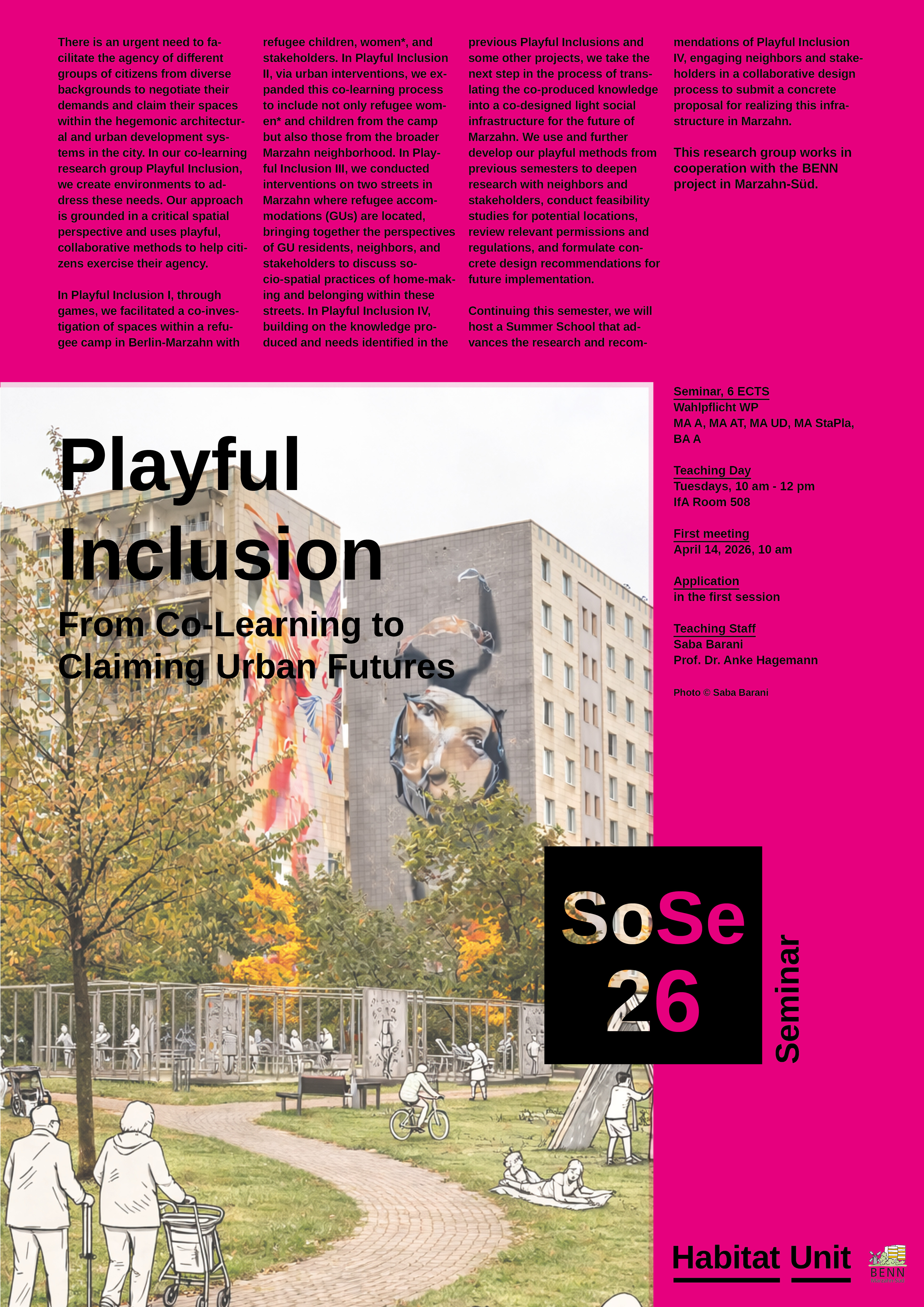 In Playful Inclusion I, through games, we facilitated a co-investigation of spaces within a refugee camp in Berlin-Marzahn with refugee children, women*, and stakeholders. In Playful Inclusion II, via urban interventions, we expanded this co-learning process to include not only refugee women* and children from the camp but also those from the broader Marzahn neighborhood. In Playful Inclusion III, we conducted interventions on two streets in Marzahn where refugee accommodations (GUs) are located, bringing together the perspectives of GU residents, neighbors, and stakeholders to discuss socio-spatial practices of home-making and belonging within these streets. In Playful Inclusion IV, building on the knowledge produced and needs identified in the previous Playful Inclusions and some other projects, we take the next step in the process of translating the co-produced knowledge into a co-designed light social infrastructure for the future of Marzahn. We use and further develop our playful methods from previous semesters to deepen research with neighbors and stakeholders, conduct feasibility studies for potential locations, review relevant permissions and regulations, and formulate concrete design recommendations for future implementation.