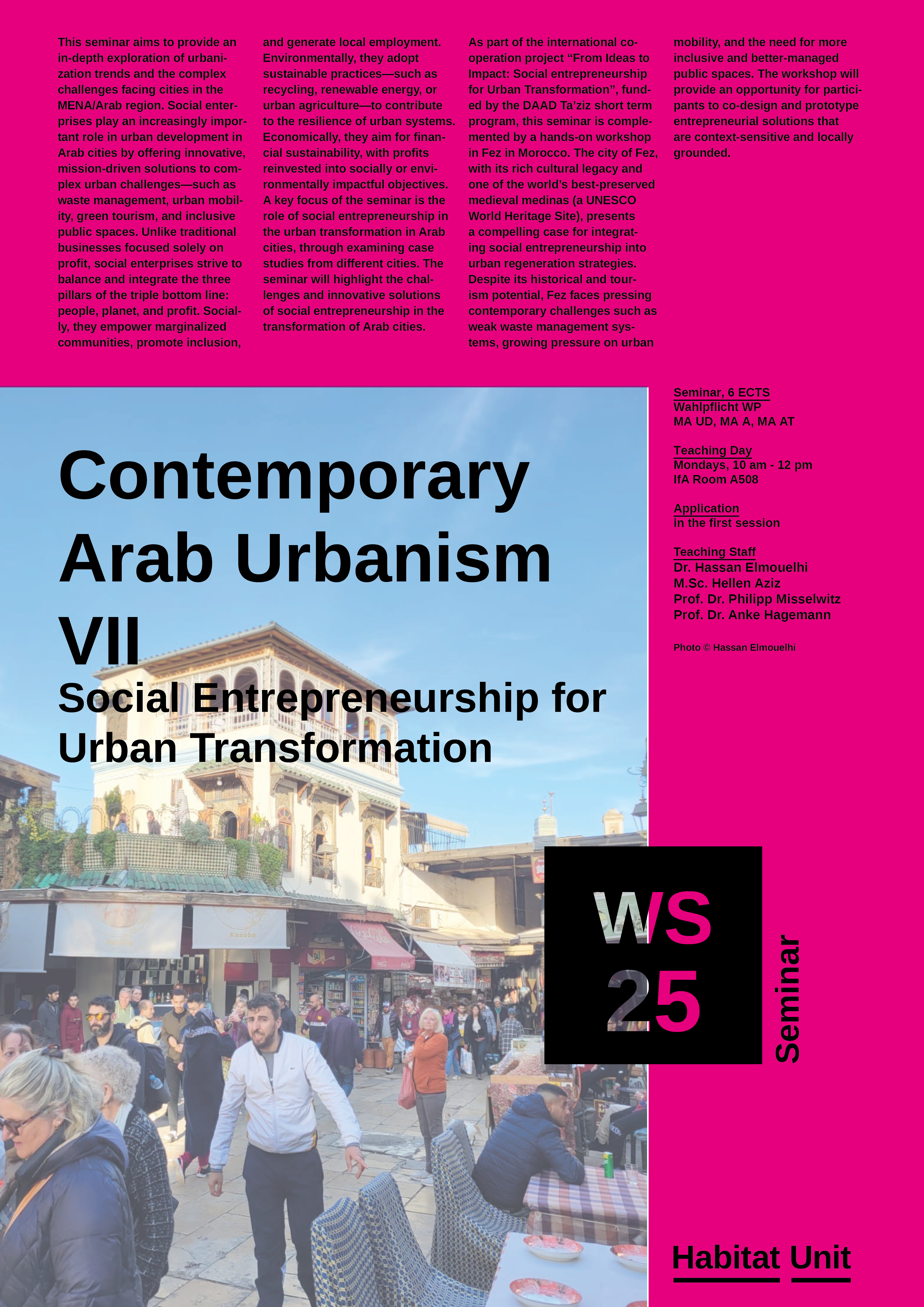 As part of the international cooperation project “From Ideas to Impact: Social entrepreneurship for Urban Transformation”, funded by the DAAD Ta’ziz short term program, this seminar is complemented by a hands-on workshop in Fez in Morocco. The city of Fez, with its rich cultural legacy and one of the world’s best-preserved medieval medinas (a UNESCO World Heritage Site), presents a compelling case for integrating social entrepreneurship into urban regeneration strategies. Despite its historical and tourism potential, Fez faces pressing contemporary challenges such as weak waste management systems, growing pressure on urban mobility, and the need for more inclusive and better-managed public spaces. The workshop will provide an opportunity for participants to co-design and prototype entrepreneurial solutions that are context-sensitive and locally grounded.