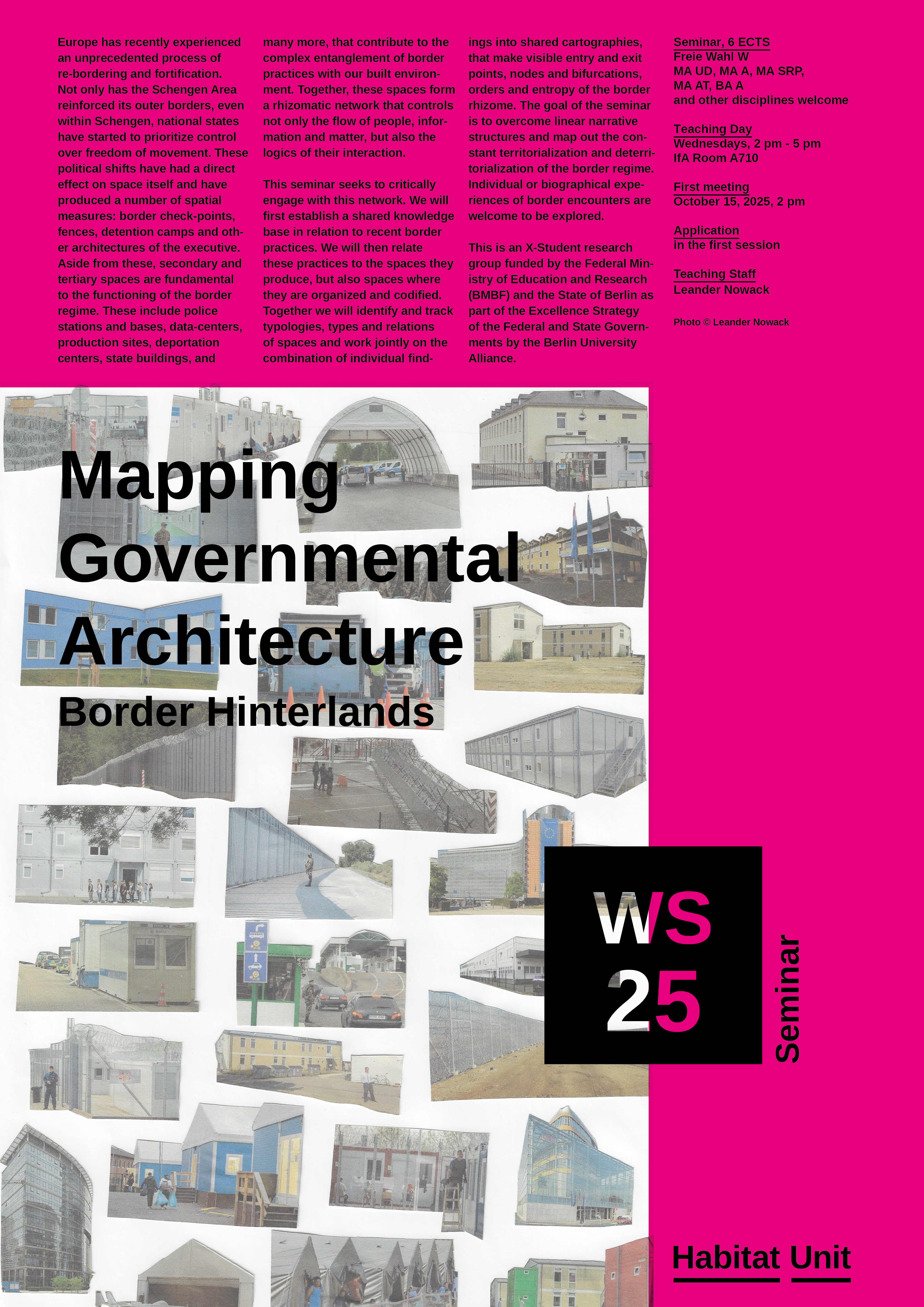 This seminar seeks to contribute to the existing discourse by critically examining the new German borders from the pers- pective of space-making. The seminar is structured into three phases: In the first phase, we will meet at TU Berlin for collective and individual readings, dis-cussions, and an introduction to spatial mapping and notation methods. The second phase will entail two daylong field trips to German border territories. We will engage in critical fieldwork, visiting one rural and one urban border, employing diverse methods such as drawing, collecting, dialogue, and other forms of cultural and corporeal documentation. In the third phase, we will meet again at TU Berlin, to collect all approaches, distill shared and contradictious themes, and discuss experiences and outcomes within the group and with guests. Individual or biographical experiences of border encounters are welcome to be explored.