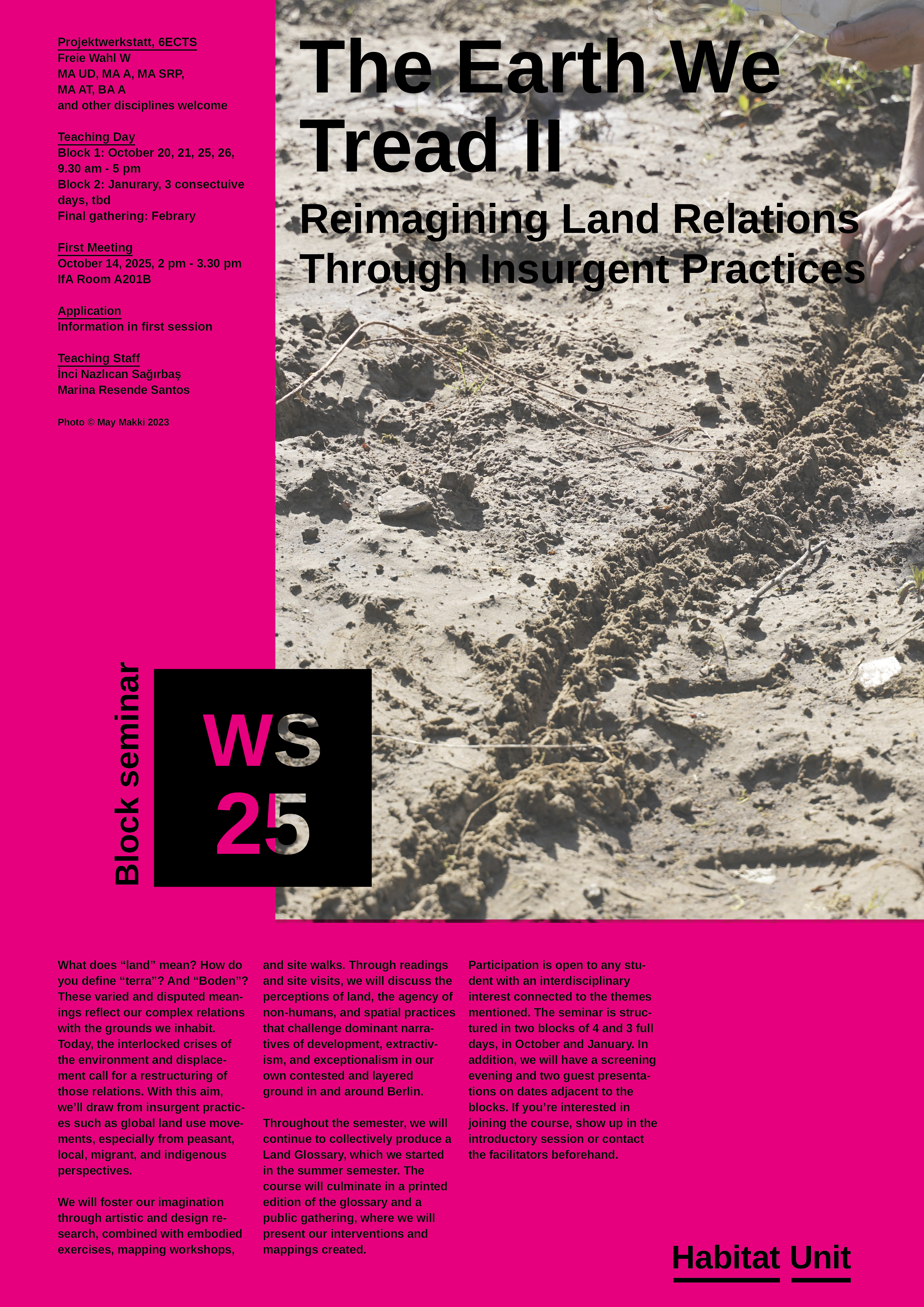 We will foster our imagination through artistic and design research, combined with embodied exercises, mapping workshops, and site walks. Through readings and site visits, we will discuss the perceptions of land, the agency of non-humans, and spatial practices that challenge dominant narratives of development, extractivism, and exceptionalism in our own contested and layered ground in and around Berlin.