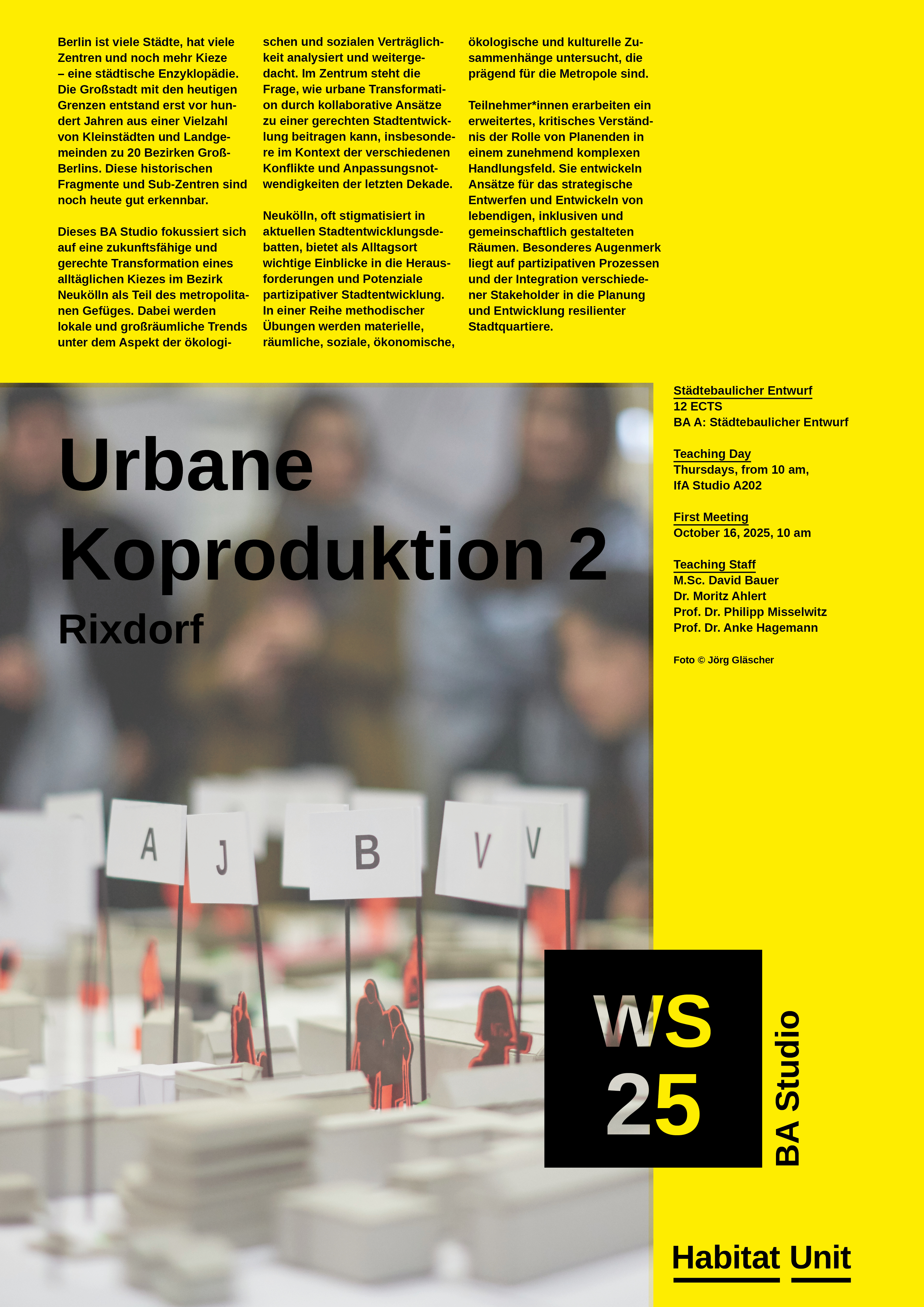 Dieses BA Studio fokussiert sich auf eine zukunftsfähige und gerechte Transformation eines alltäglichen Kiezes im Bezirk Neukölln als Teil des metropolitanen Gefüges. Dabei werden lokale und großräumliche Trends unter dem Aspekt der ökologischen und sozialen Verträglichkeit analysiert und weitergedacht. Im Zentrum steht die Frage, wie urbane Transformation durch kollaborative Ansätze zu einer gerechten Stadtentwicklung beitragen kann, insbesondere im Kontext der verschiedenen Konflikte und Anpassungsnotwendigkeiten der letzten Dekade.