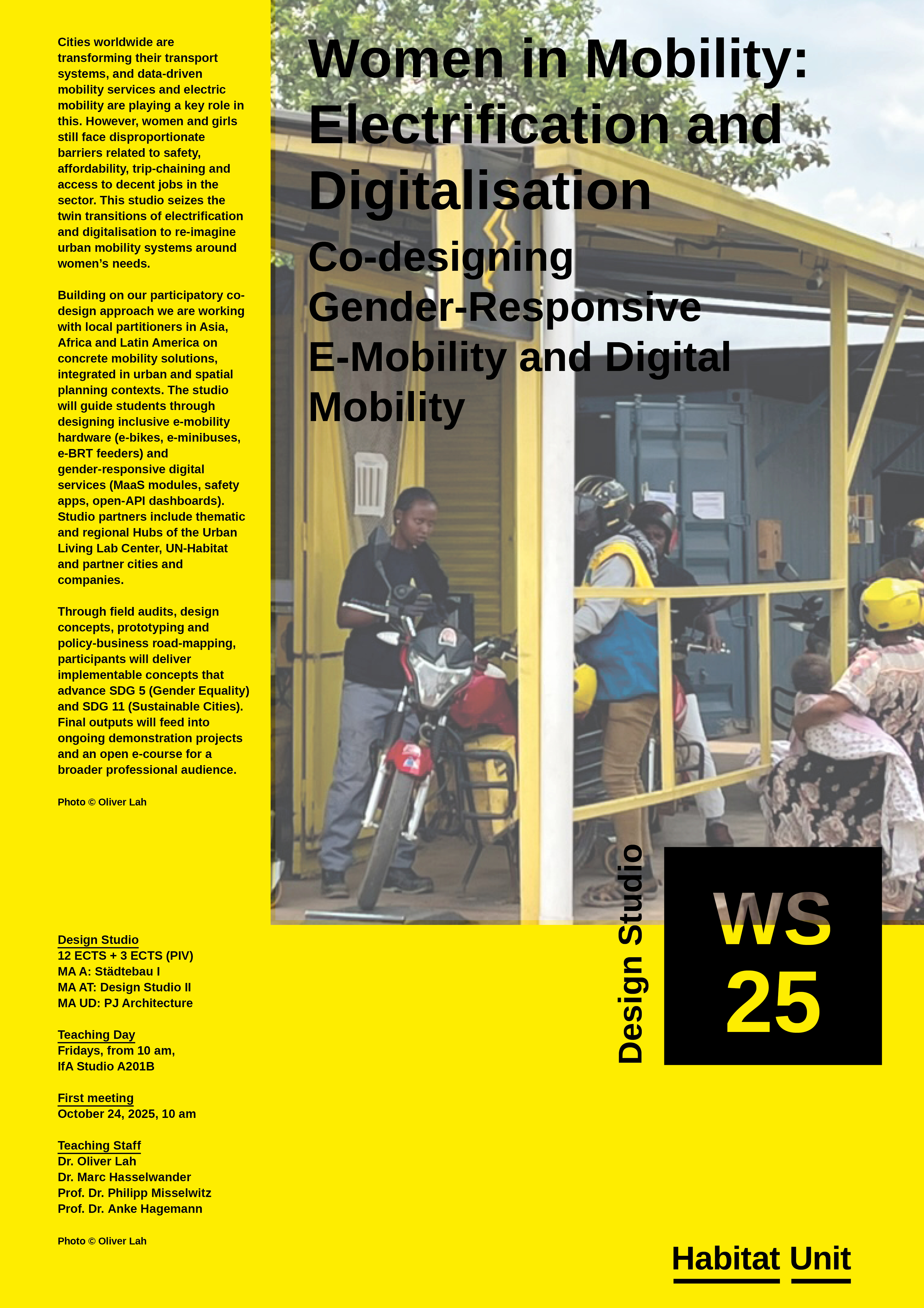 Building on our participatory co-design approach we are working with local partitioners in Asia, Africa and Latin America on concrete mobility solutions, integrated in urban and spatial planning contexts. The studio will guide students through designing inclusive e‑mobility hardware (e‑bikes, e‑minibuses, e‑BRT feeders) and gender‑responsive digital services (MaaS modules, safety apps, open‑API dashboards). Studio partners include thematic and regional Hubs of the Urban Living Lab Center, UN‑Habitat and partner cities and companies.